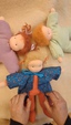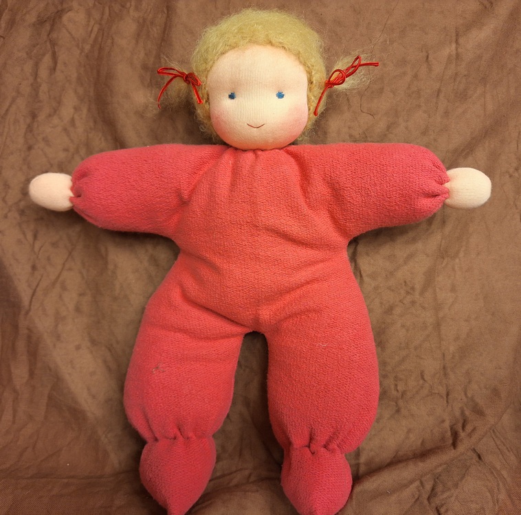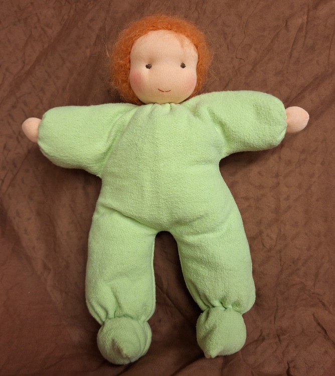 Panenka - miminko - má vlásky z mohérové příze, v sobě malé váčky s pískem kvůlu reálnější váze. Je zabalená do plenky z mušelínu a oblečena do vlněného spacáčku upleteného z merino příze.