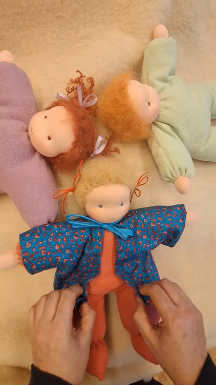 Oblékací panenka s vlásky z rozčesané merino příze. Oblečení v různých variantách.