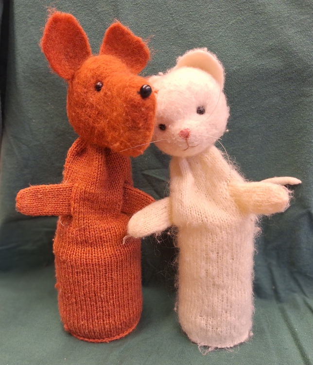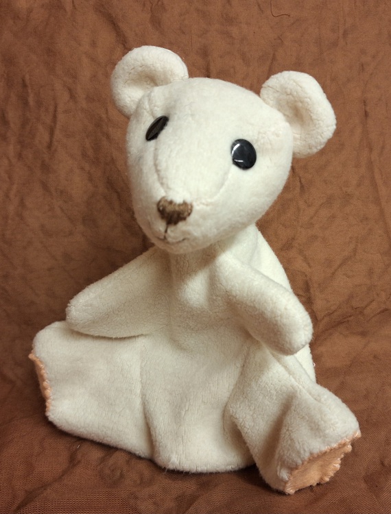 Medvídek z měkkého beránka (bavlna bambus), maňásek na dospělou ruku - na všech pět prstů, čímž velmi získává na živosti. Na dětskou verzi lze zmenšit. Pomocník v různých výchovných situacích či veselý společník. Výška 25 cm. Spotřeba rouna asi 40 g.
