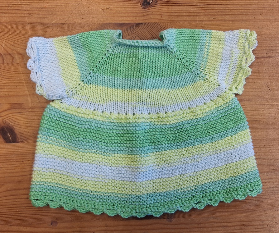 Příze - kombinace jednobarevného mohéru (25g) a vzorovací ponožkové příze (50g) na šatičky pro oblékací panenky - s návodem a rozpisem na 3 velikosti (i tak záleží na velikosti jehlic a tom, jak utahujete).
