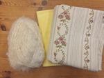 Materiál na žlutou s kabátkem s růžemi v pruzích a natur vlásky