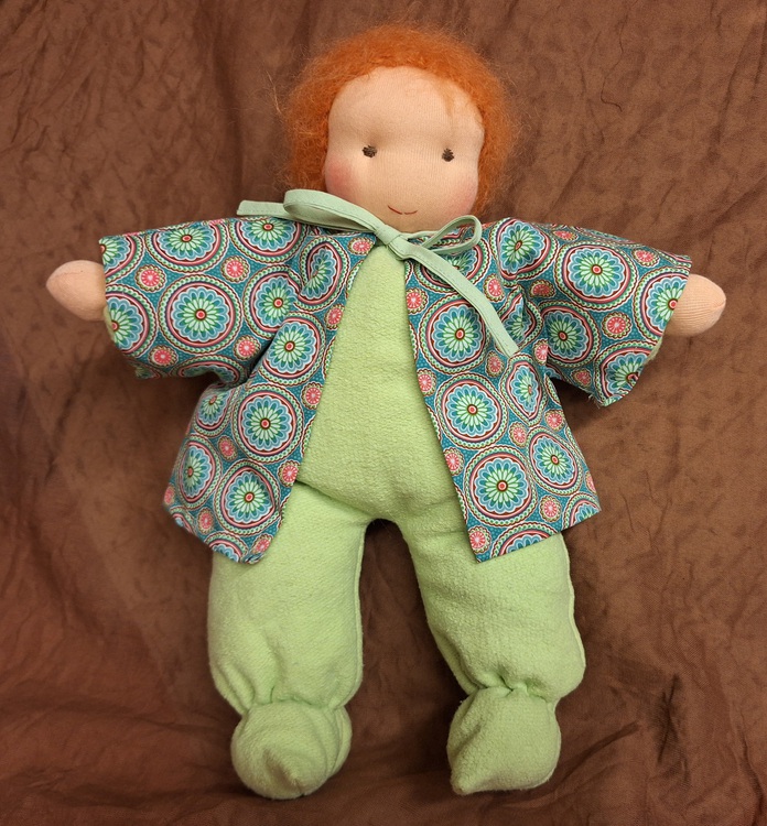 Panenka 35 cm z bavlněné teplákoviny měkkým rubem navrch. S vlásky z mohérové příze a oblékacím kabátkem z bavlněného pláténka.